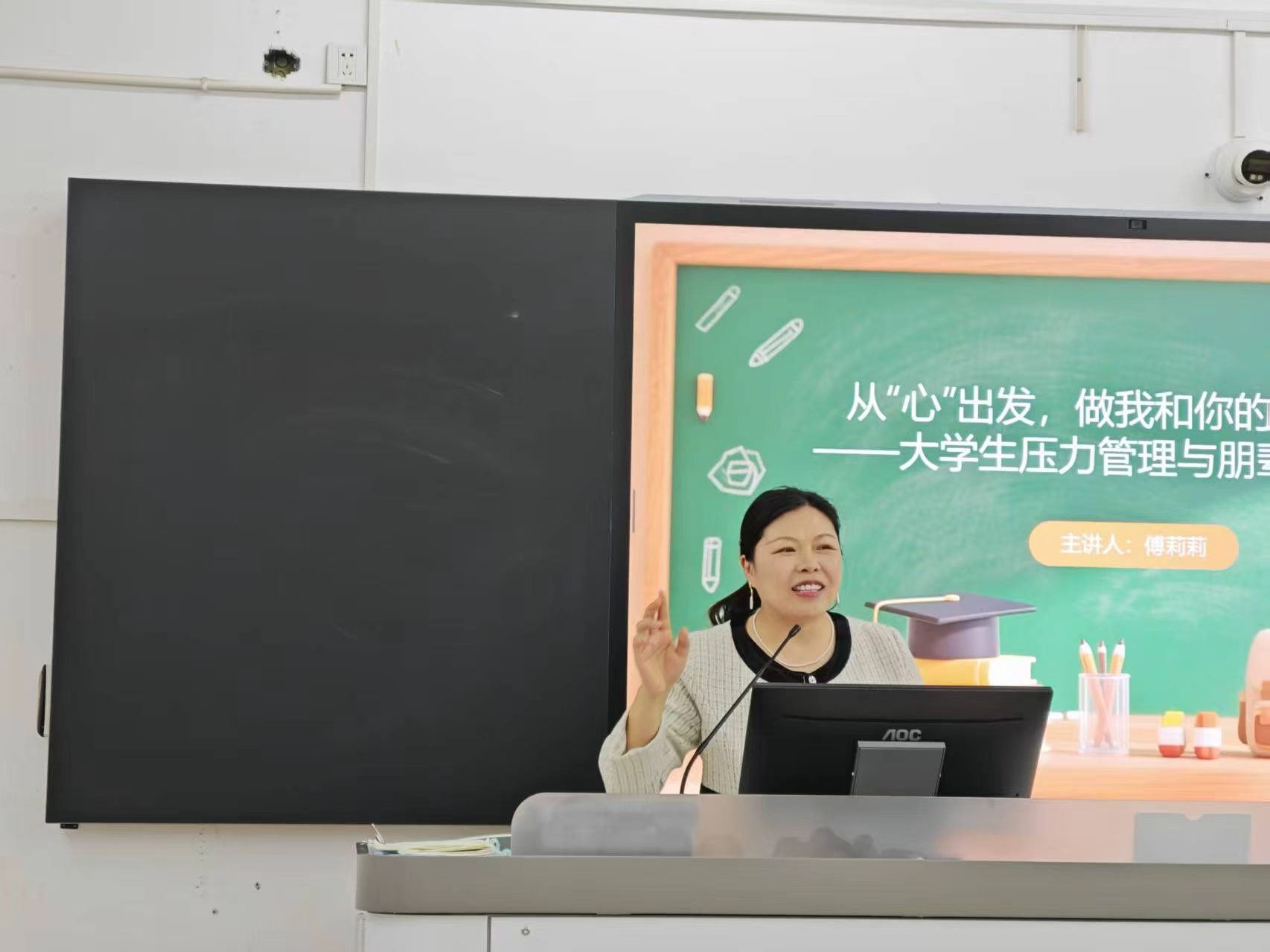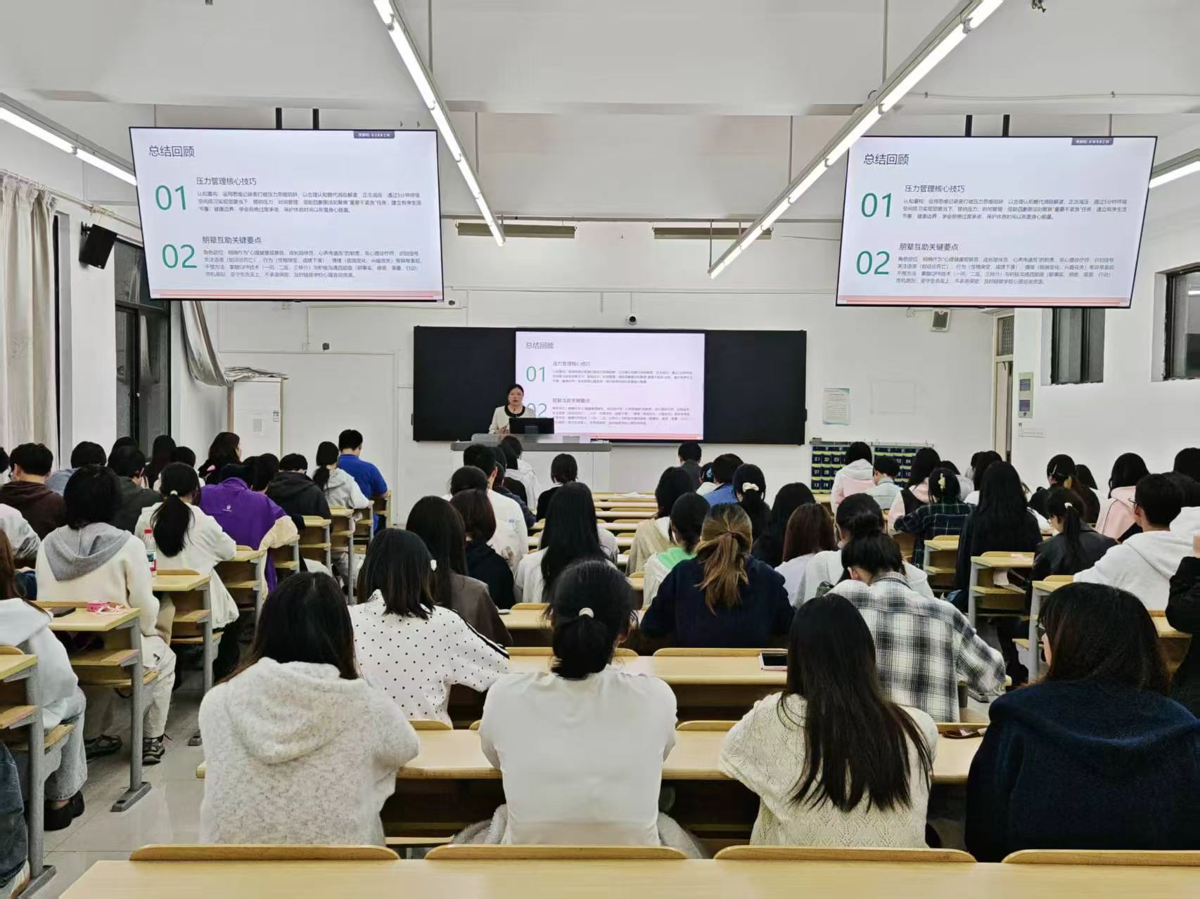 培训内容围绕压力管理与朋辈互助两大主线展开。傅莉莉老师从压力管理核心技巧、朋辈互助关键要点入手,讲解如何科学调节压力、释放情绪,以及如何有效帮助身边同学。